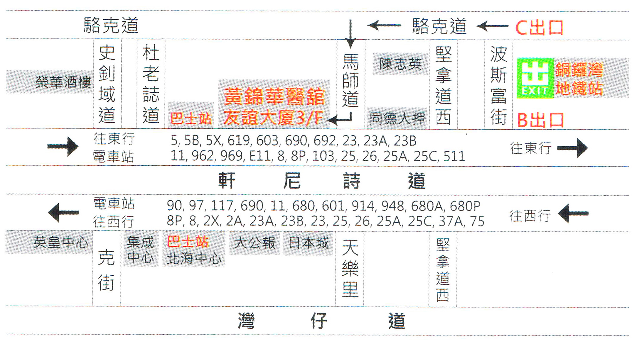 銅鑼灣地鐵站C出口轉出電車路向灣仔步行約10分鐘。